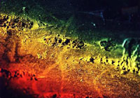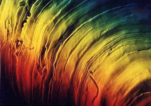 lassen sie mich das an einem beispiel erklären: so hängt hinten im raum das hinterglasbild "the only dance there is". ganz einfach ein buchtitel von richard alpert, einem zeitgenossen von timothey leary, auch er harvard-professor für psychologie, später bekannt unter dem namen baba ram dass. the only dance there is. alles leben ist tanz. ein beispiel: nehmen wir einen baum, der wird zerlegt in zahnstocher. untersuchen wir ihn, dann finden wir holzfasern. betrachten wir diese unterm mikroskop genauer, finden wir aus zellen gebildete strukturen, diese wiederum bestehen aus molekülen und diese wiederum aus atomen. die atome sind aufgeteilt in elektronen, positronen und neutronen - bis zu den kleinsten subatomaren teilchen - den leptonen, mesonen und den baryonen. und da gibt es ein phänomen: sie existieren zum teil nur eine milliardstel sekunde , sie entstehen und zerfallen. existenz entsteht und zerfällt sofort wieder. da diese teilchen eines haben, nämlich energie, könnte man wirklich sagen: alles leben ist tanz, tanzende energie. die welt ist maya-illusion. eine wunderschöne annhäherung des buddhismus an die moderne atomwissenschaft. was sie in dieser ausstellung sehen, sind die verschiedensten bilder , gegenbilder meiner inneren welt, meiner anteilnahme am thema mensch, natur und chaos, mein interesse in ZEN oder der ganzheitlichen transpersonalen sicht der dinge. sie sehen die verschiedensten techniken, leider nicht öl oder acryl auf leinwand, dafür fehlte einfach der platz. so zum beispiel aquarelle, auch ein grossformatiges mit dem titel "she sends special signals to me". nun wer sendet mir die besonderen signale? es ist die welt, in der ich lebe. oder fotomalerein auf cibachrome: traum-landschaften, virtuelle unsichtbare gebilde oder die reihe rainbow, hier mit den spektralfarben gemachte nahaufnahmen aus meiner persönlichen kleinen sammlung. stücke die ich von meinen reisen in die welt mitgebracht habe. sie finden weiter eine rauchzeichung, einige mischtechniken aber auch eine neon-arbeit mit pilz, wachs, blei, gips, farbe und fotos: alles was man zum träumen braucht.