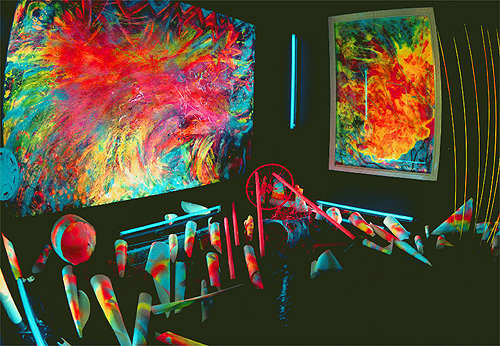 lichtkunst; UV-raum, abgedunkelt mit schwarzer folie 500 cm x 400 cm x 400 cm |