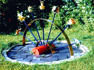 unter diesem liegt ein halbierter holzstamm, rot lasiert. in den bohrungen sind 7 blaue glasstäbe eingelassen, die je eine grosse farbige glasierte keramik tragen. die keramiken sind bis zu 30x30x30 cm gross und erinnern an aztekische symbole. die plastik ist ein sinnbild der aufgehenden sonne.